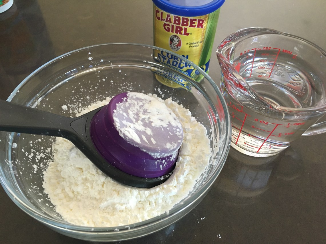 - 2 parts cornstarch (e.g. 2 cups but might neeed to keep adding more in to get it more ‘solid’ and goopier)
