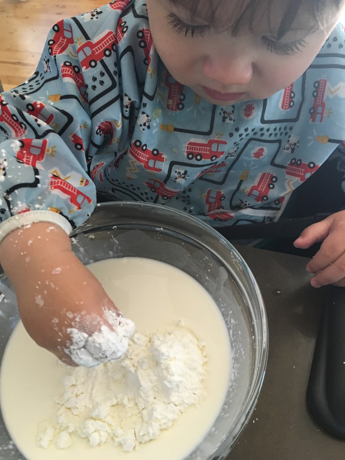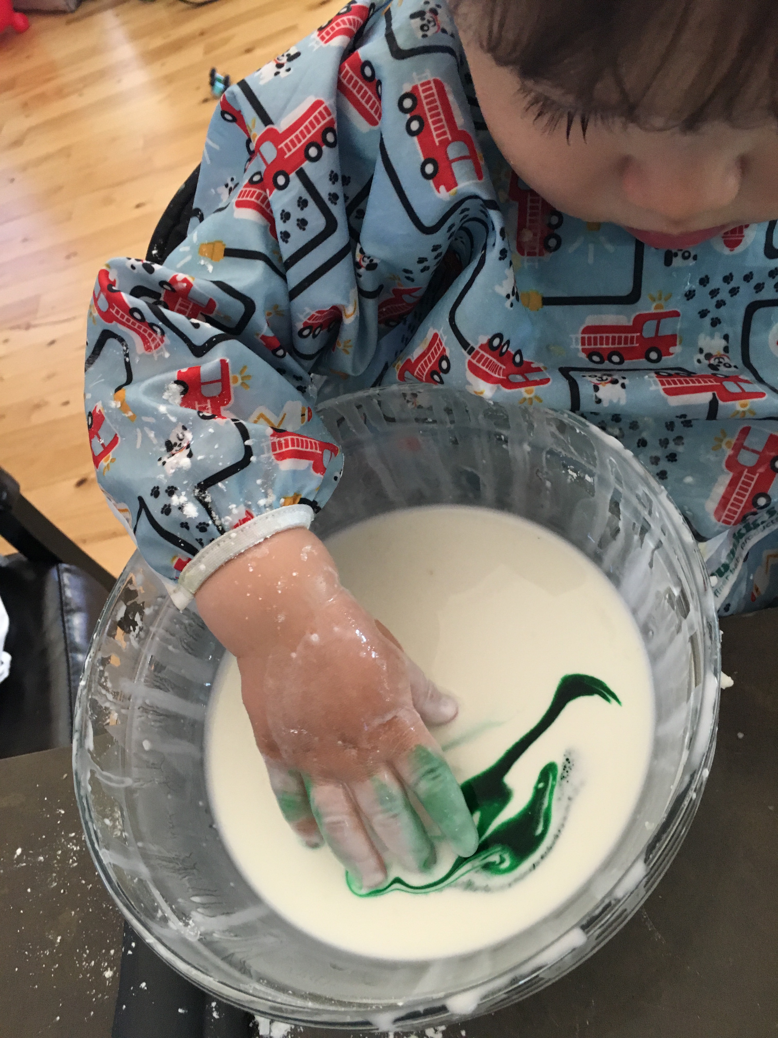 Playing with slime or more ‘scientifically’ oobleck is fun for all ages but is a great messy sensory play experience with a 16 month old (and a multi-decade old person). Oobleck is slime or more specifically a fictional non-Newtonian fluid precipitate (yes, properties of both a liquid and solid) made famous by the pen of Dr. Seuss. Squeeze it in your hands and it will seem solid but it runs like a liquid. Note: it does get messy, especially with a little one, so lay down some paper, throw on a big and put the dog in another room (oops, learned that one). It is totally fine if they eat some, tastes like paste but isn’t harmful. We played for probably 45 minutes with this, including 10 minutes to get it all mixed up (part of the fun). THAT is pretty miraculous. If you store it, keep in airtight container.