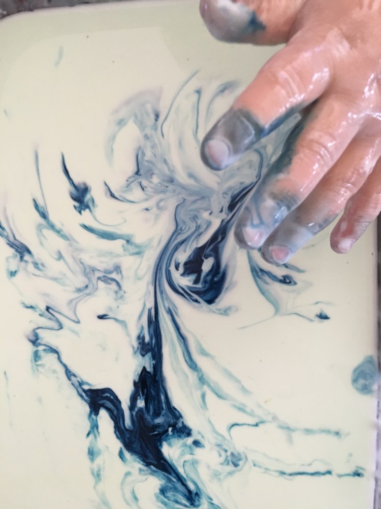 Try things like moving your hand fast and slow in the container. Then try patting the surface (it feels solid). Take and handful and squeeze. Rake hands back and forth. Just have fun. We used a 13 x 9 pyrex dish to keep it more contained but additional play area (and easier to prevent it from being spilled or tossed) but you could use a bowl or several small containers.
