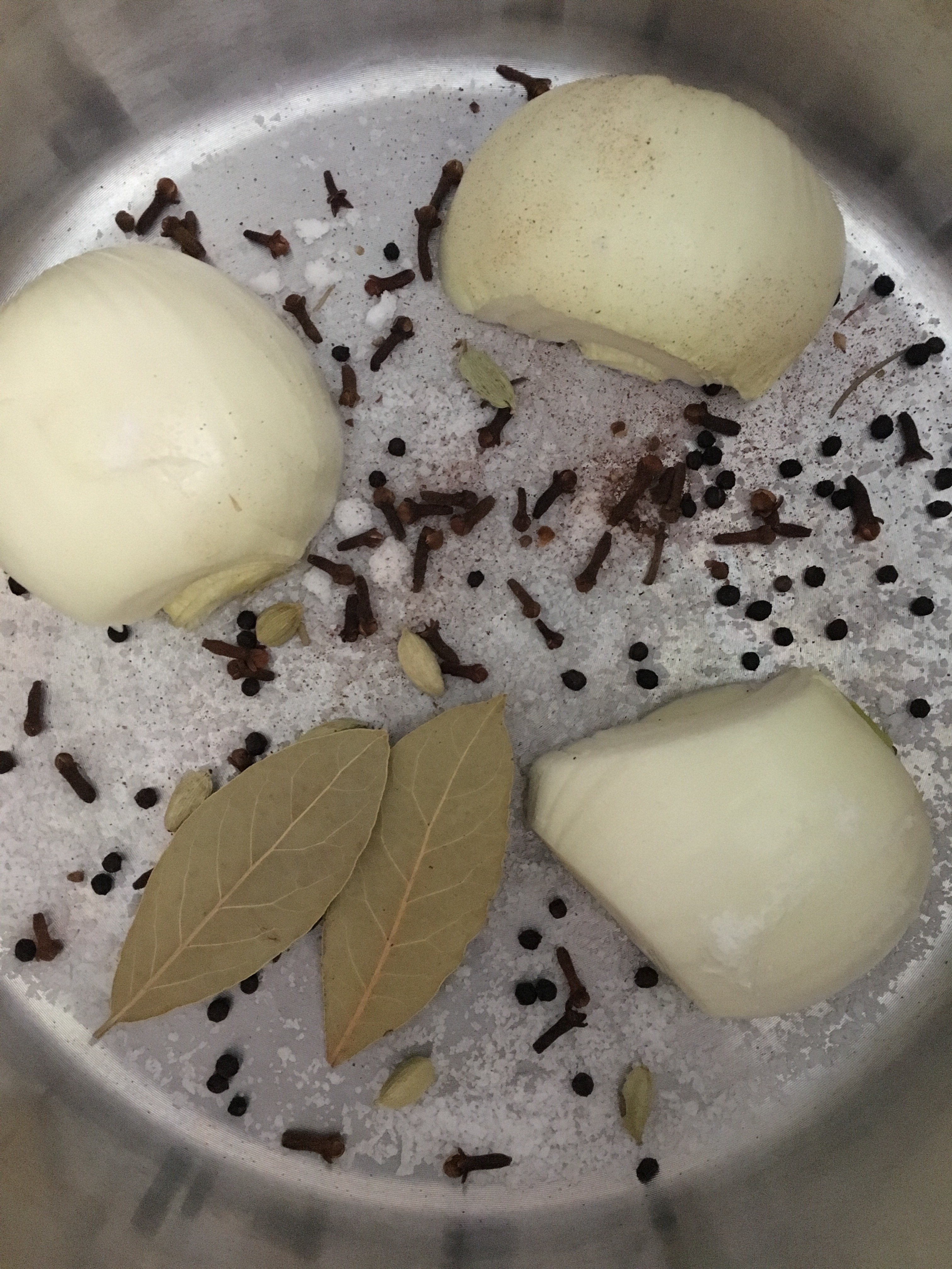 - In the pot of your pressure cooker put the first eight ingredients (lamb, onion halves, whole spices) and pour in enough water (tap is fine) to cover everything. Somewhere between 4 and 6 cups of water.