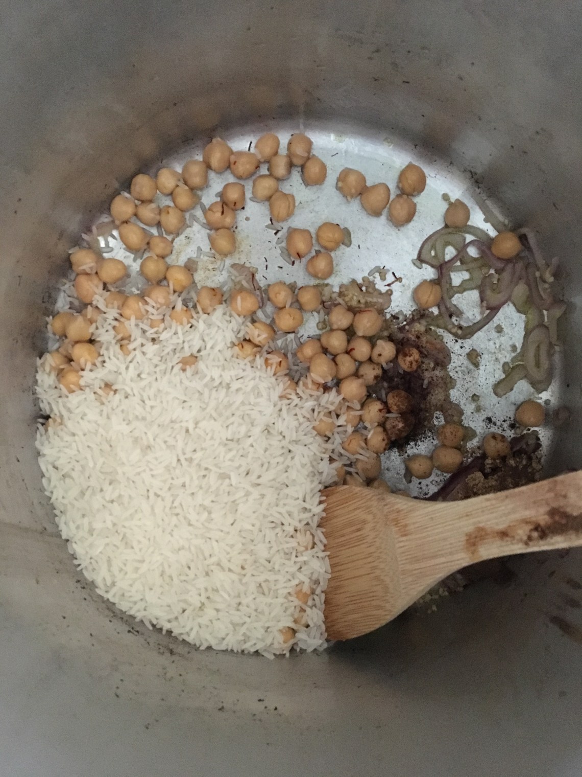 - Turn on the heat and add some olive oil! This time add the chopped onion (second listing on ingredients). Cook and stir until it starts to soften, then add in garlic. But just for half a minute or so, so you can start to smell it. Add in the garbanzo beans, rice and ground spices. Stir around getting the hot, covered in oil and really starting to be fragrant, about 60 to 90 seconds.