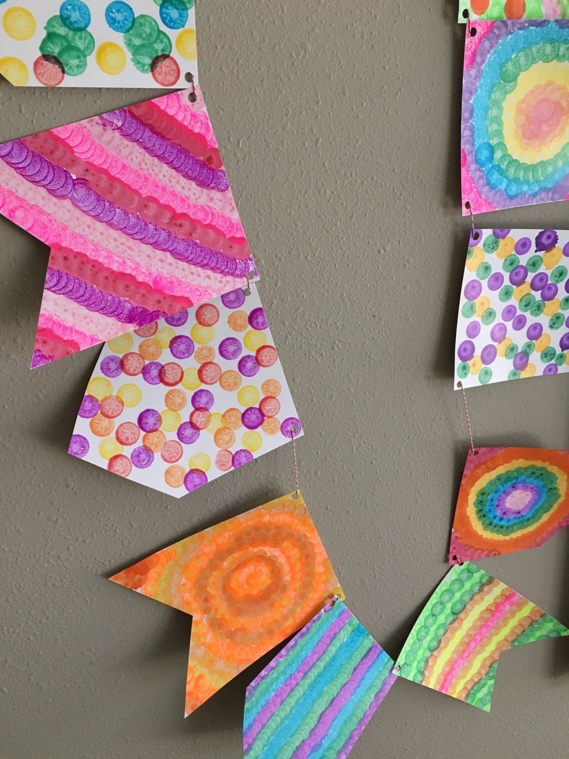 Buntings are an easy and versatile way to decorate. There are so many great kits and pre-cut products out there. This version using poster board and dot paint markers. I did this as a shower activity but had some left over bunting pieces and we did more painting together. My toddler-guy likes the dot markers (and making a mess and tasking the paint) so this was pretty fun activity for all of us. I enjoy making designs too. Who doesn’t love polka dots or pretending you are an epic bingo player….