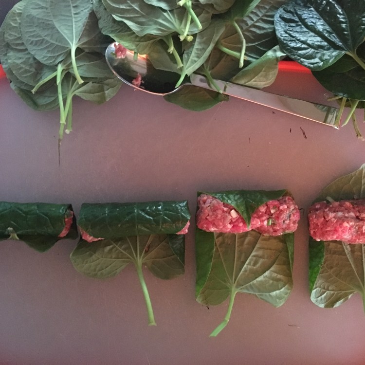 The following recipe is easy to scale but you ultimately control the number of individual rolls based on how much meat you put in each leaf. For parties or as main dish, I would suggest make several small batches as it gets harder to mix the seasonings evenly. To make in advance it is best to prep and roll and then refrigerate. They freeze ok but better fresh – the leaf can get weird. To cook I prefer to place on foil lined pan and put under the broiler. You can certainly grill but would want to skewer the rolls so they don’t fall through the grill.