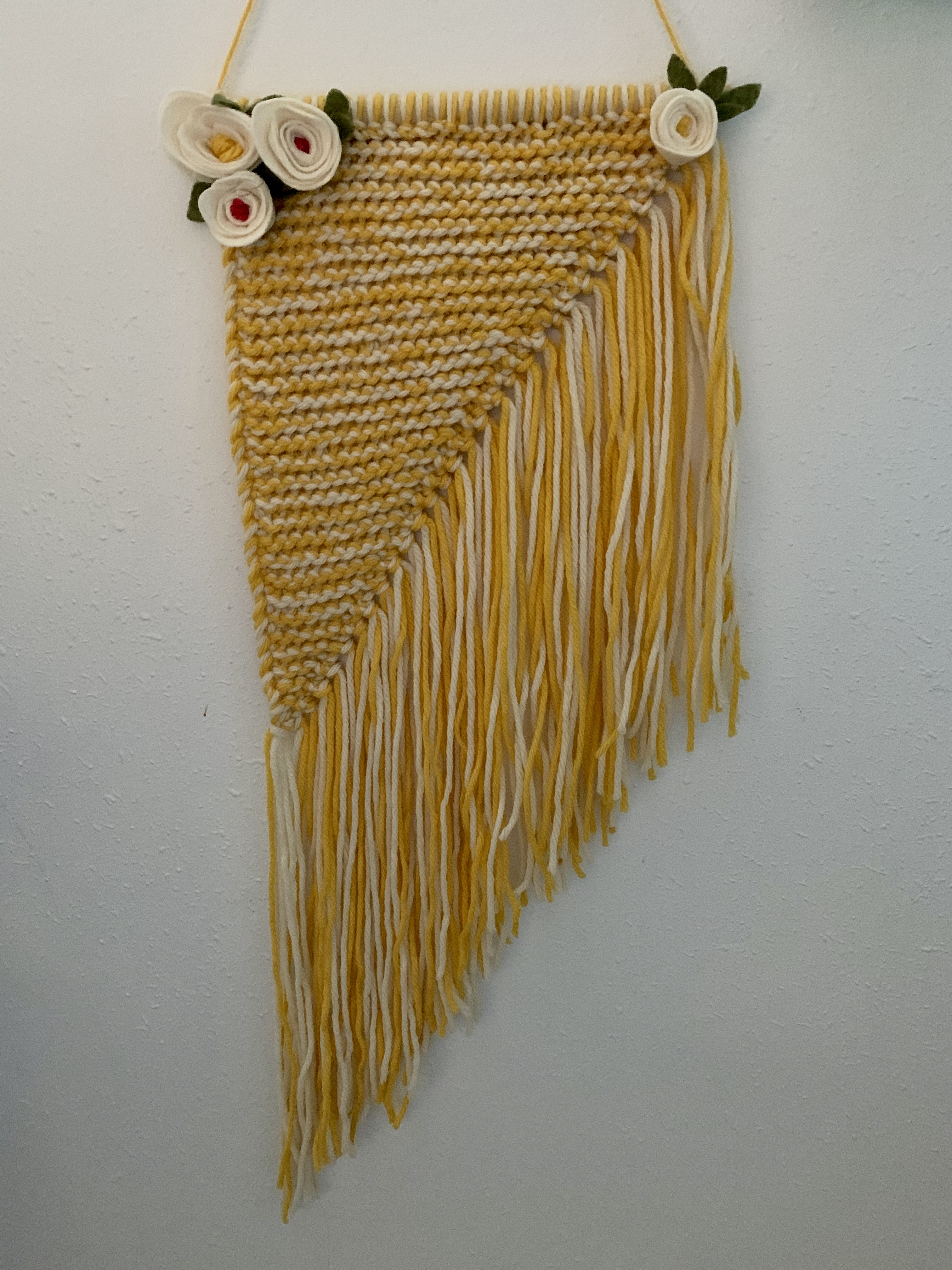 Pieces of ‘flare’ – using bits and baubles on hand like felt scrap flowers, pine cones, wool beads etc. And if I am being honest, these also cover up where the yarn hanger ties to dowel. There is also a crochet version in her Les Cayes pattern collection with baubles and it is on my list as I work on crochet skills this winter. I’ll list my finished wall hangings in my Etsy shop as they are completed and could likely be convinced to knit up custom versions as well.