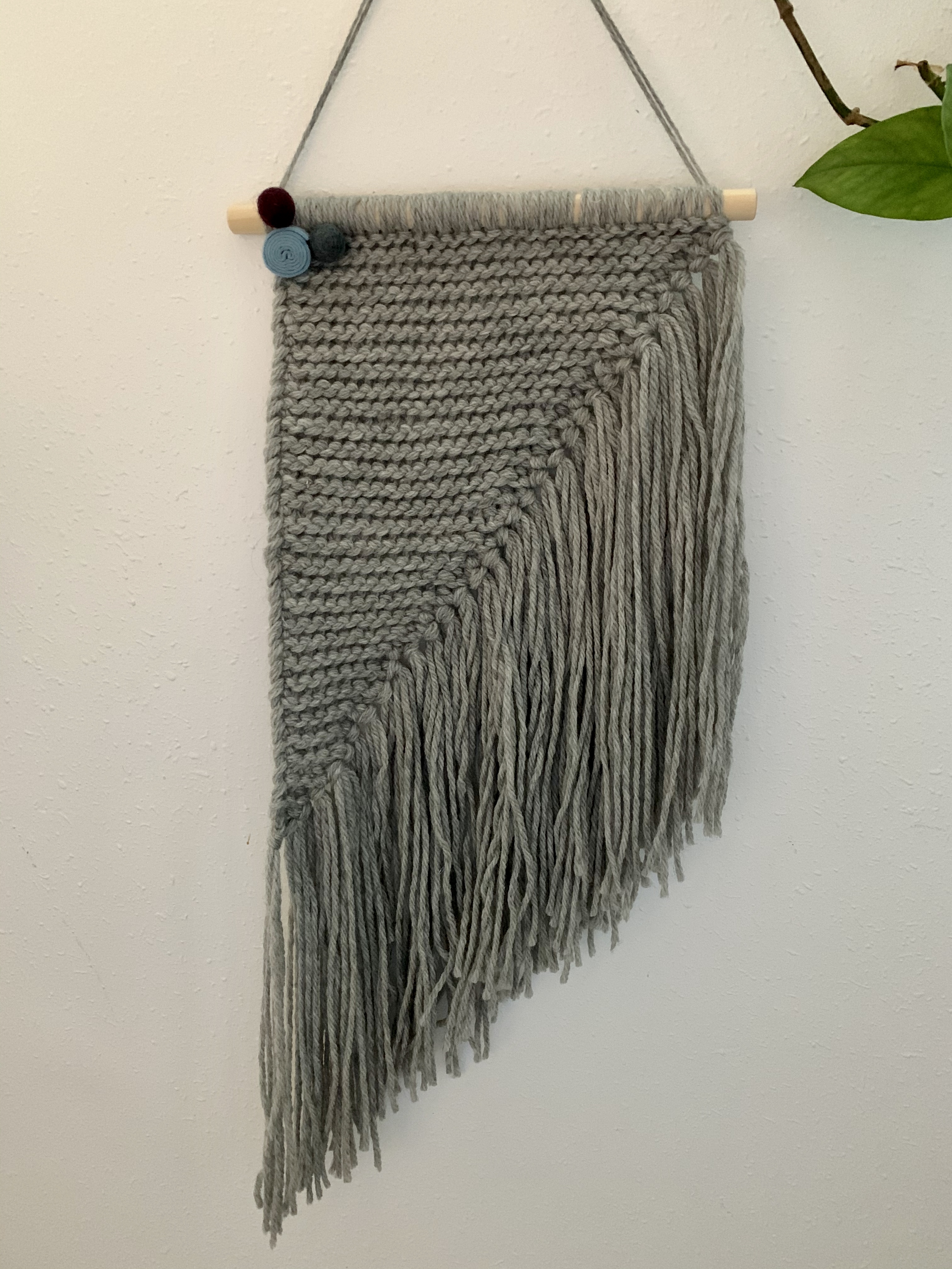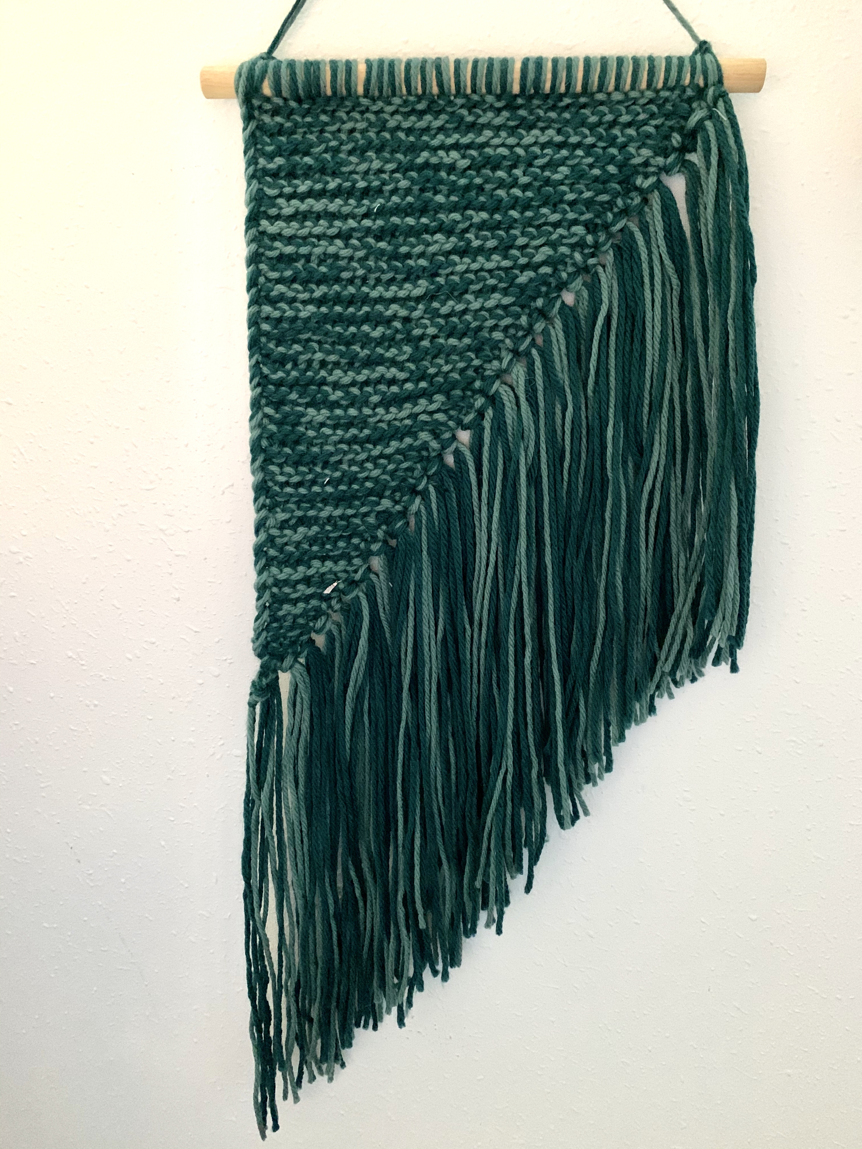My Grandma Mac taught me to knit almost two decades ago (umm, wow, hadn’t done that math till now) and my technique is more English or throwing but with more useless motion and a funky hold on the needles but it works and thus no learn-how-to-knit tutorials from me. My chosen knitting projects fall in to the more simple/repetitive category that allow me to relax into the stitching and enjoy the feel of the yarns and slow reveal of the resulting product. This wall hanging (Debrosse The Les Cayes pattern) has been a great pattern to work through some partial skeins of Cascade wool in my stash (which is respectable although pales in comparison to fabric stash). It is knit with either bulky weight or in this case two strands of worsted weight yarn, which create additional design options. Using size 10.5 needles and a garter stitch it works up quickly. After creating the tassels and hanger loop, I blocked the pennant. I love Debrosse’s minimalist modern knitting style and also wanted to try adding some more textural elements to a few of them, changing the style.