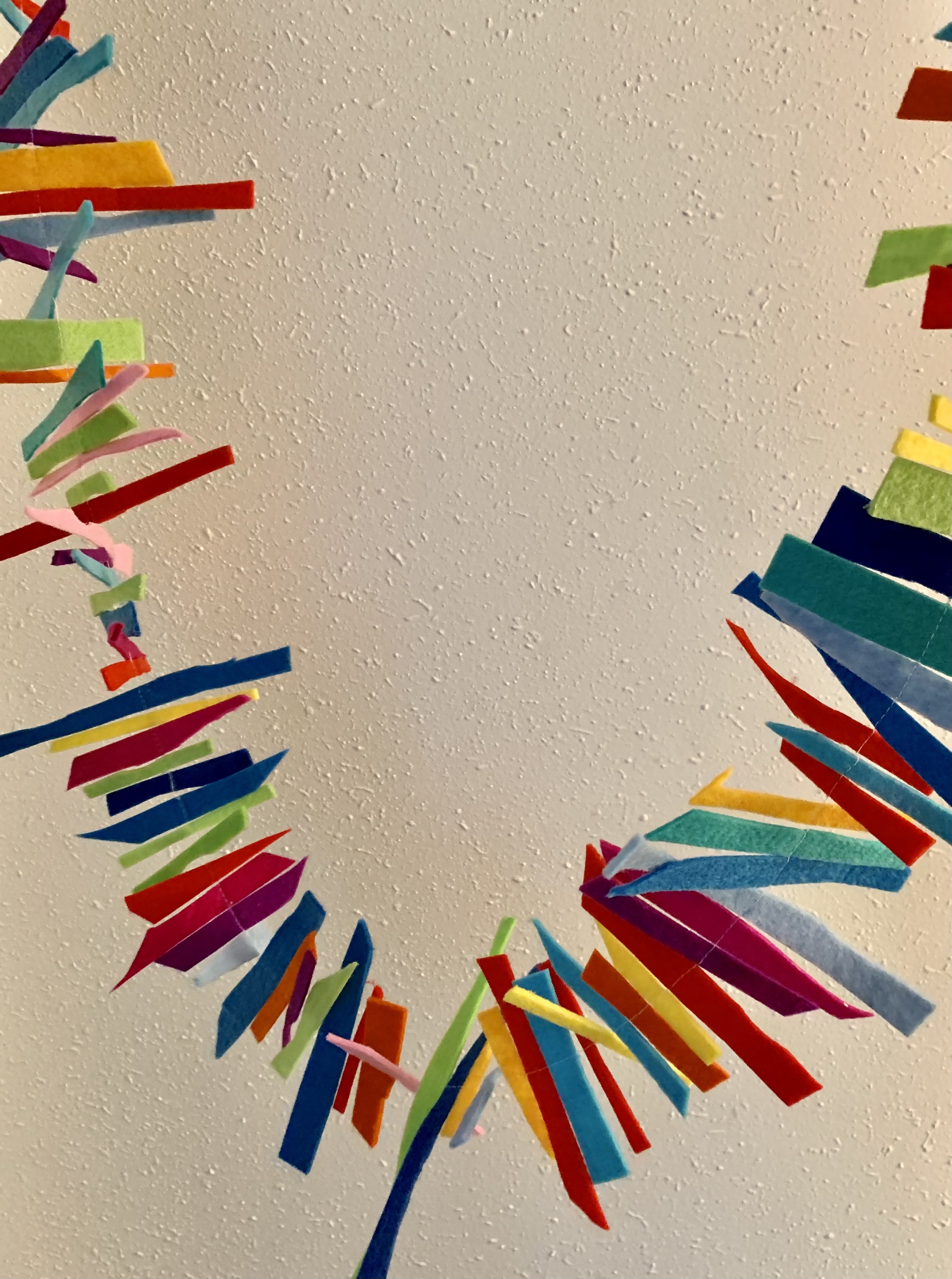 Here are two ideas for other felt shapes. quick circles (just for fun or a nod to ornaments/Christmas lights, see also the paper version using greeting cards) and one using scraps pieces. This scrap one hangs in my crafting space.