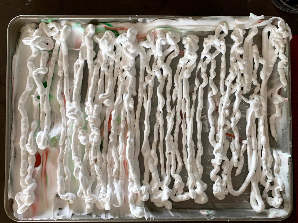 - Thin layer of shaving cream foam in a jelly roll or quarter sheet pan is perfect. You do not need inches of this stuff