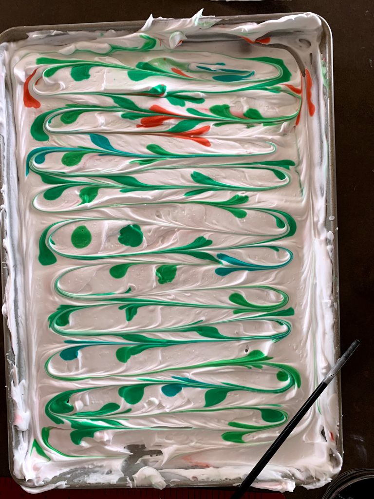 Bee and I did it – after years of eyeing a variety of DIY tutorials for marbling paper with shaving cream, we made 100+ holiday cards marbled in mostly reds and greens or blues and yellows. The anticipation of how the swirled color will reveal itself on the paper is the best part. Swirl a lot or a little. Time lapse at the end.